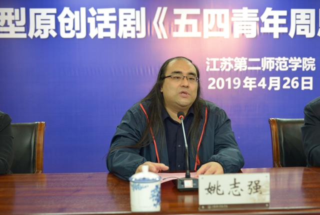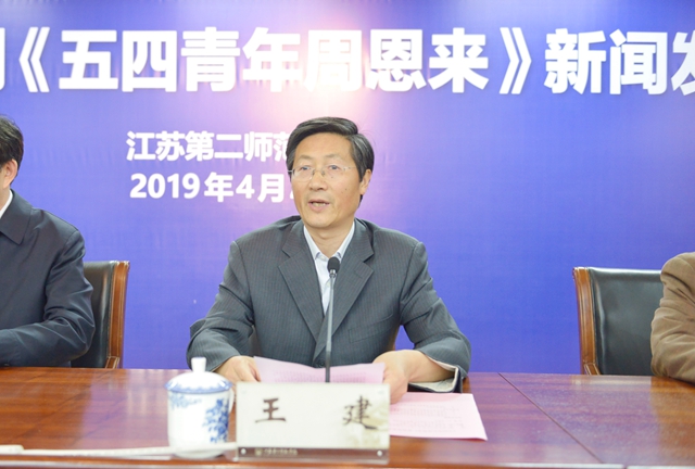 王建致辞。他说,2019年是建国70周年,“五四”运动100周年,为铭记奋斗历史、弘扬伟人精神,我校于2018年12月成功申报江苏2019年度艺术基金大型舞台资助项目——大型原创话剧《五四青年周恩来》。目前该剧的排演工作取得阶段性成果,即将公演,这是我校文化建设上的又一件大事、喜事,也是大型原创戏剧在重大题材方面的一次新尝试、新突破。我校高度重视文化建设,始终把繁荣校园文化作为各项工作的重要抓手。近年来,我校牵头成立江苏诗歌教育联盟和研究中心,启动京杭大运河江苏流域戏曲文化传承创新工程,获评中华优秀传统文化传承推广中心;取得全国大艺展最高奖1项、全国排舞联赛冠军5项、省大艺展特等奖2项,去年举办的《运河怀古》美术作品展和《水路·戏路·传承之路》成果展演广受社会好评,一个以中华优秀传统文化传承发展和艺术经典教育为主要目标的新型师范人才美育培养体系正逐步形成。《五四青年周恩来》是我校对建国70周年和“五四”运动100周年的一次隆重献礼,是担当文化传承创新使命的一次生动实践。