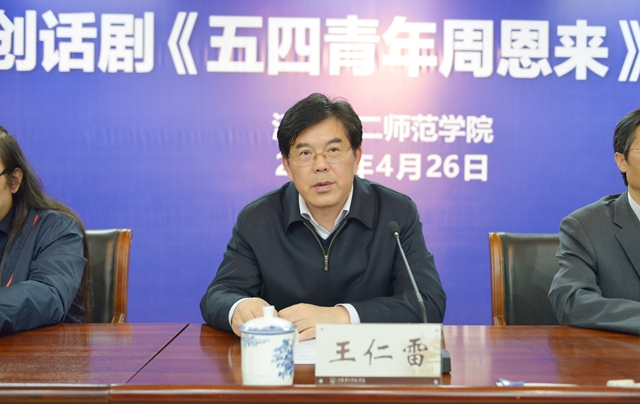 4月26日上午,我校在草场门校区举办大型原创话剧《五四青年周恩来》新闻发布会。党委书记王仁雷,校长王建,党委副书记、副校长刘继红,《五四青年周恩来》编剧胡学纯、导演姚志强,周恩来的扮演者马笑在主席台就座。参加发布会的还有新闻媒体记者,剧组聘请的顾问和学者,话剧的主创人员和工作人员。会议由刘继红主持。