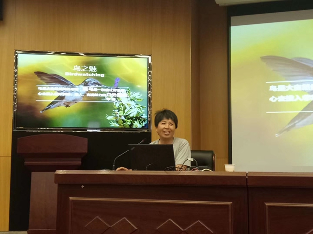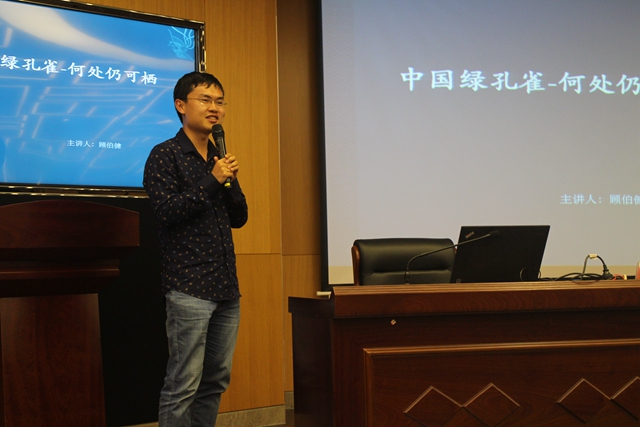 晚上举行了该项目主题讲座首讲,袁屏、顾伯健主讲,陈建琴主持。袁屏讲座题为“鸟之魅”。他介绍了他拍摄的30余种我国本土野生动物以及各种动物的行为特点、分布和生境,分享了观测和保护我国野生动物的宝贵经验和野外观测的艰辛和乐趣。顾伯健讲座题为“中国绿孔雀——何处仍可栖”。他结合大量实景照片,和大家分享了自己对绿孔雀的研究成果,介绍了中国文化中的、蓝孔雀和绿孔雀的区别、绿孔雀历史分布变迁、绿孔雀的生存现状、受胁程度,让大家感触深刻。