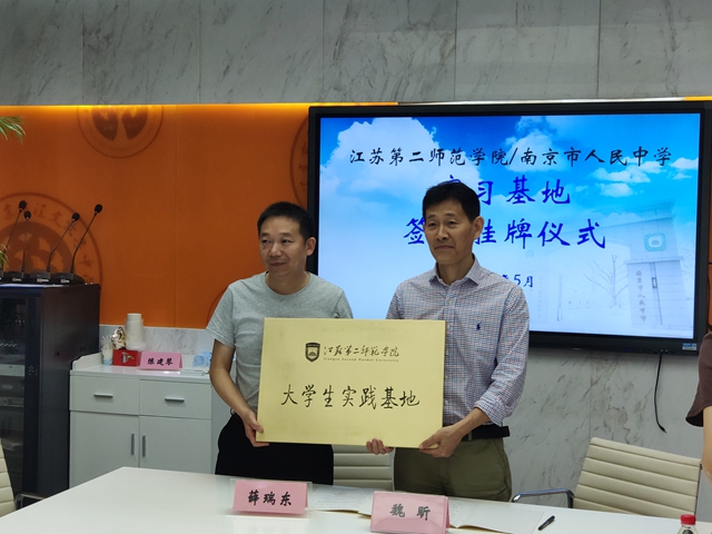 5月27日上午,我校与南京市人民中学(汇文女中)举行实习实践基地签约授牌仪式。南京市人民中学校长魏昕,我校教务处副处长薛瑞东及生命科学与化学化工学院副院长花书贵、朱学伸和生物教育研究所所长高学林等出席仪式。南京市人民中学高一年级主任冷小兴主持仪式。