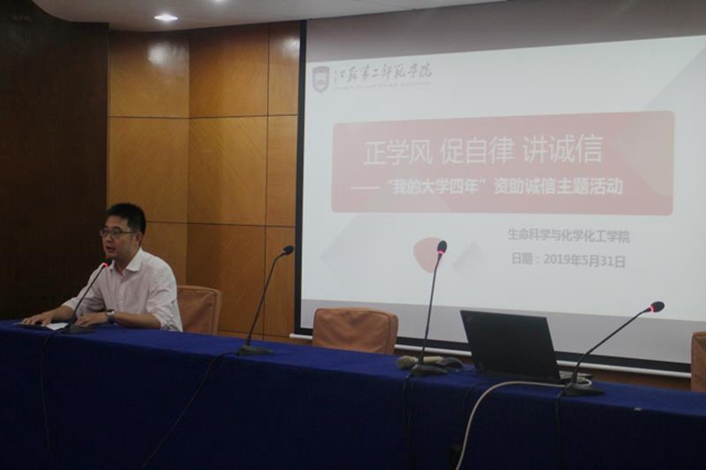 5月31日下午,生化学院举办正学风、促自律、讲诚信——“我的大学四年”资助诚信主题活动。该院院长蒋功成、校学工处副处长眭春良等出席活动。学工办主任朱琨主持活动。
