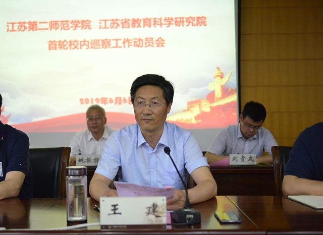 院纪委书记、巡察工作领导小组副组长陈金如宣读《关于成立江苏第二师范学院、江苏省教育科学研究院巡察工作领导小组的通知》,宣布首轮内部巡察人员分组情况及被巡察单位名单。
