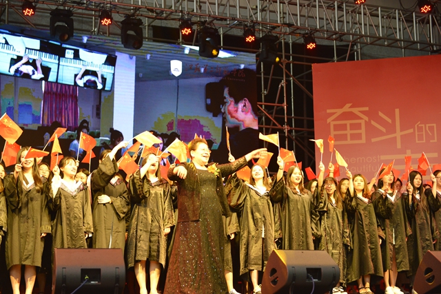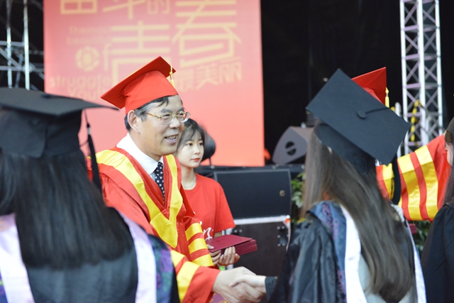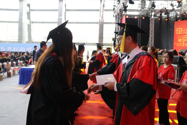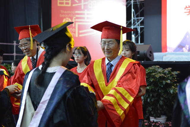校领导、二级学院负责人、主要职能部门负责人为全体毕业生颁发了毕业证书,为每一位学士学位获得者拨正流苏、授予学位证书并合影留念。典礼在全场高唱《我和我的祖国》中圆满落幕。