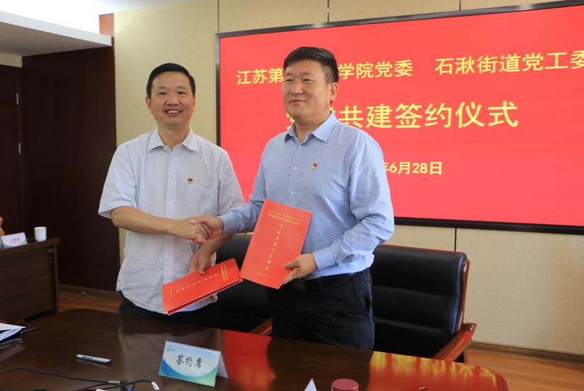 石湫街道党工委书记樊斌同志和江苏第二师范学院党委副书记潘文同志签署党建共建合作协议。