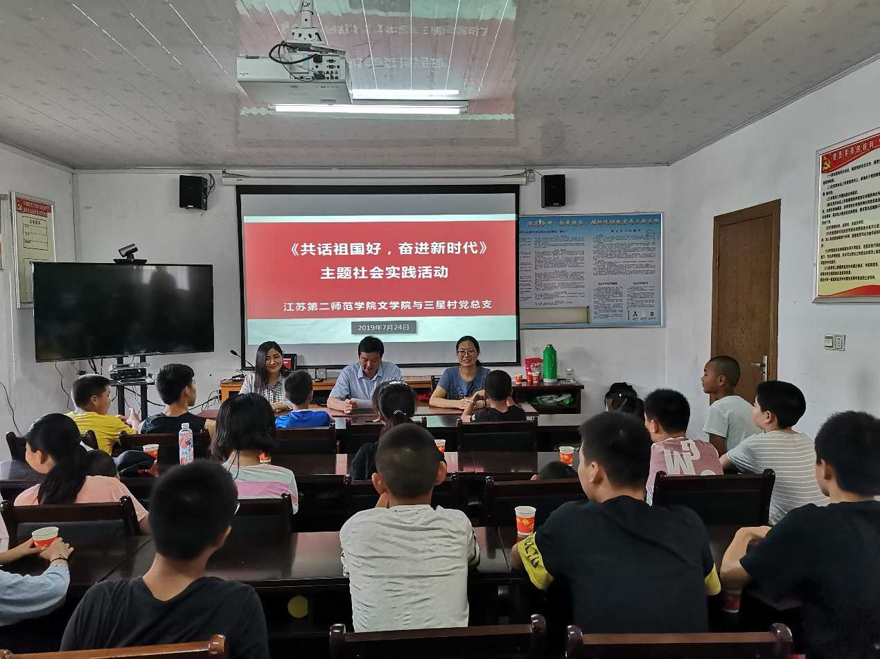 7月24日上午,我校文学院党总支书记刘莹、党总支副书记陶赋雯、学生党支部书记戴晓凤、青年教师陈进武和张响一行赴溧水区石湫三星村开展“共话祖国好,奋进新时代”主题实践活动。
