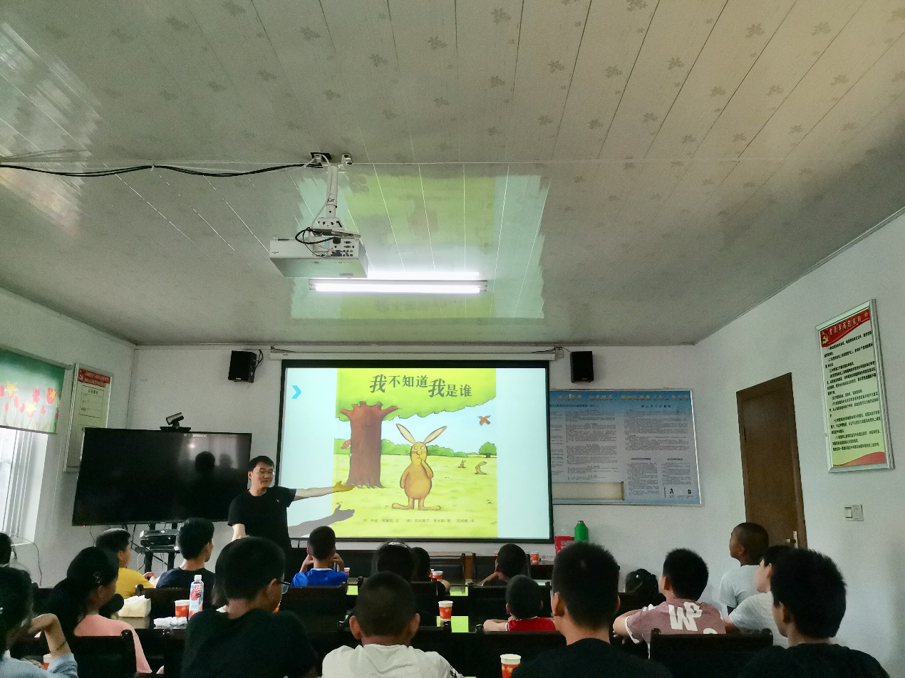 随后,陈进武老师开启此次主题活动的第一讲“我们如何读绘本”,他从儿童文学阐释、绘本解读和推荐书目三个方面形象生动地向当地中小学生介绍了读绘本的方式方法,举例贴近实际,引起现场的共鸣。