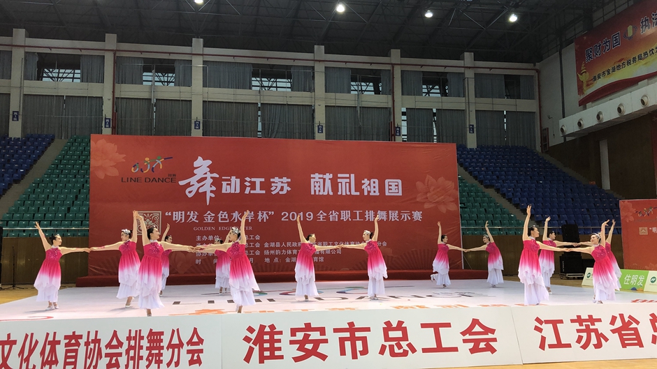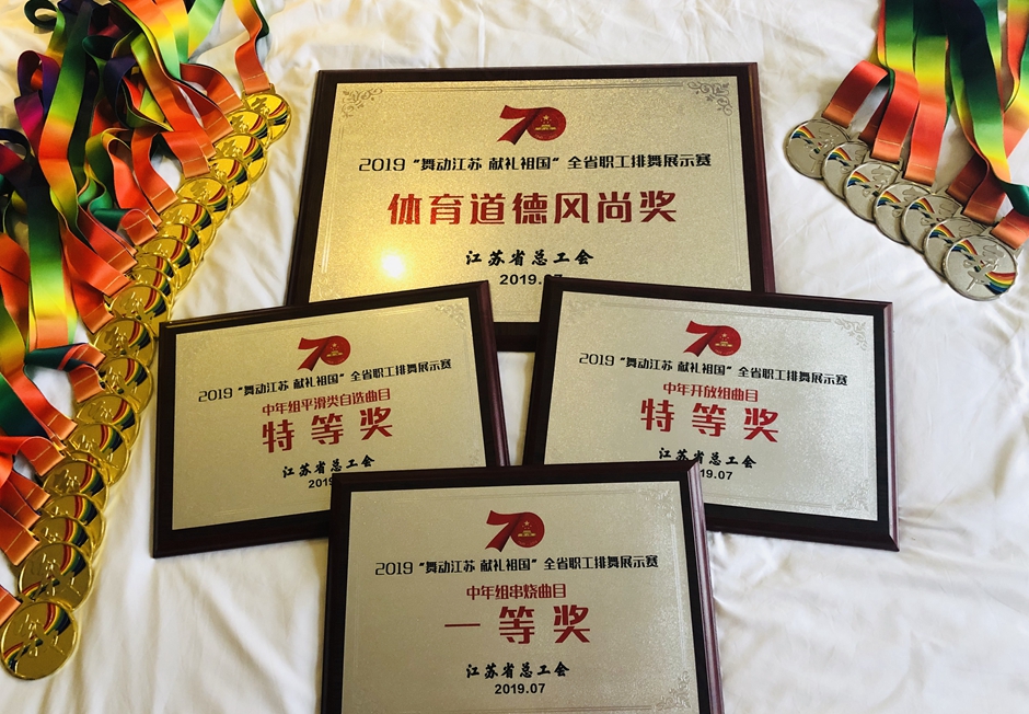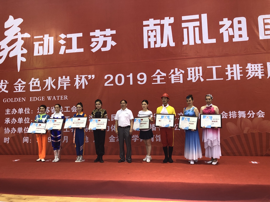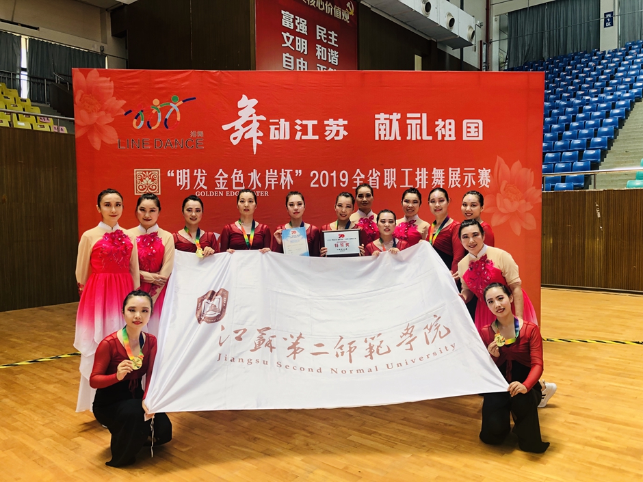 7月28日,2019“舞动江苏 献礼祖国”全省职工排舞展示赛在金湖县体育馆隆重举行。来自全省各地的15支代表队200名运动员参加比赛。我校工会组建的教职工排舞队参加比赛,获得中年组平滑类自选曲目特等奖、中年组开放曲目特等奖和中年组串烧曲目一等奖的好成绩,同时,获得了“体育道德风尚奖”。