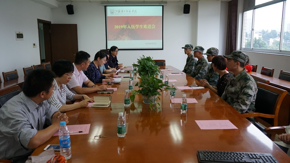 9月2日上午,我校在草场门校区举行2019年入伍学生欢送会,欢送即将奔赴军营的4名热血青年。党委副书记、副校长刘继红出席会议。学工处处长、人武部部长杨思贤,学工处副处长、人武部副部长杨嵘,物理与电子工程学院党总支副书记李佶莲、体育学院党总支书记田磊、物理与电子工程学院辅导员金永生、军事教研室副主任冯丽娜、4名新兵及家长代表参加会议。杨思贤主持会议。