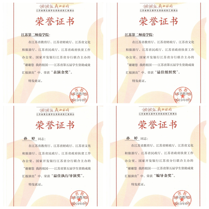 日前,由江苏省教育厅、省财政厅、省文化和旅游厅、省民政厅、省政府扶贫工作办公室、国家开发银行江苏省分行联合主办的“谢谢您 我的祖国——江苏省第五届学生资助成效汇报演出”评选结果公布,我校选送的昆曲《游园情》喜获“表演金奖”,我校喜获“最佳组织奖”。大艺中心主任孙婷荣获“编导金奖”、“最佳执行导演奖”。