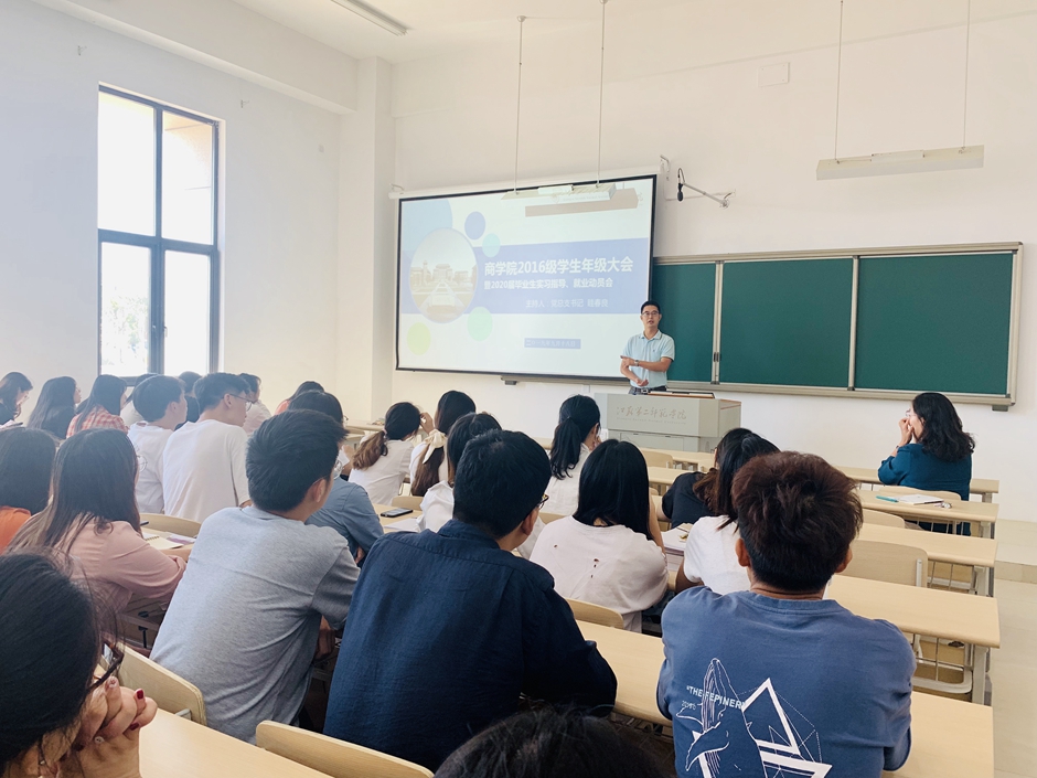 9月18日,商学院在石湫校区博学楼1-110室召开2016级学生大会暨毕业实习、就业动员会。副院长王丽出席,党总支书眭春良主持会议。