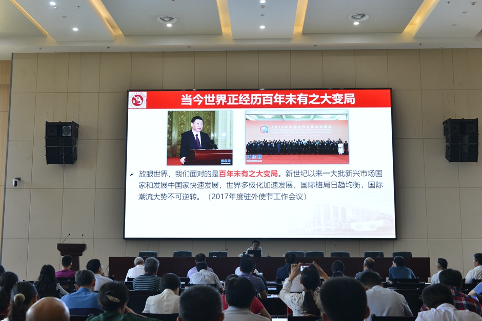 梅秀庭作题为《深入贯彻习近平新时代中国特色社会主义思想——外交思想的视角》的专题辅导报告。他介绍了当前国际形势,分析了中美两国关系面临的困境和香港目前的局势及其背后的产生原因,阐述了习近平外交思想形成的时代背景及其必然性,提出了从根本上把握机遇、迎接挑战的途径:努力把握好“一个核心”、“一条道路”、“一个理论”,“努力做好我们自己的事情”。