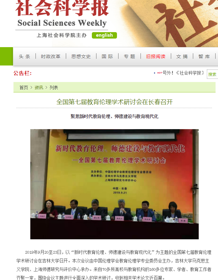 2019年9月20日至23日,由中国伦理学会教育伦理学专业委员会主办,吉林大学马克思主义学院、上海师德研究与评价中心承办的全国第七届教育伦理学术研讨会在吉林大学召开。来自全国的70多所高校160余名专家就“新时代教育伦理、师德建设与教育现代化”的主题展开深入探讨, 会上,张勤教授作首批“全国师德实践与创新基地”单位总结评估报告,包括我校在内的6家单位正式成为“全国优秀师德实践与创新基地”。