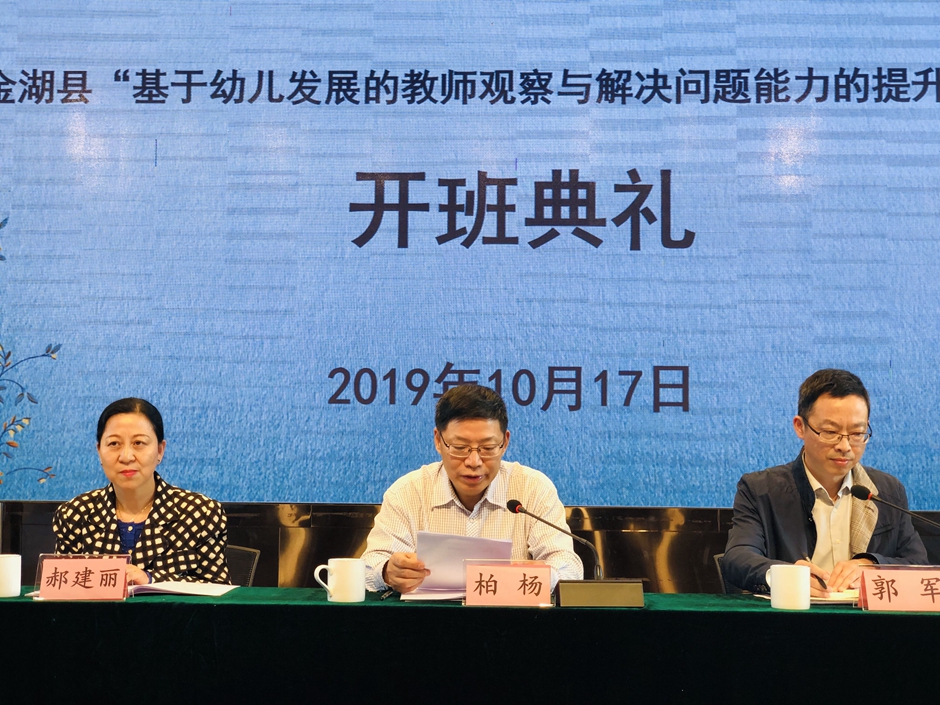 开班仪式由金湖县委教育工委委员、县教师发展中心副主任李中兵主持。我校继教院副院长柏杨、金湖县委教育工委副书记郭军、金湖县吴运铎实验幼儿园园长蒋萍及金湖县教育体育局相关部门负责人出席仪式,全县188名学前教育乡村骨干教师参加仪式。