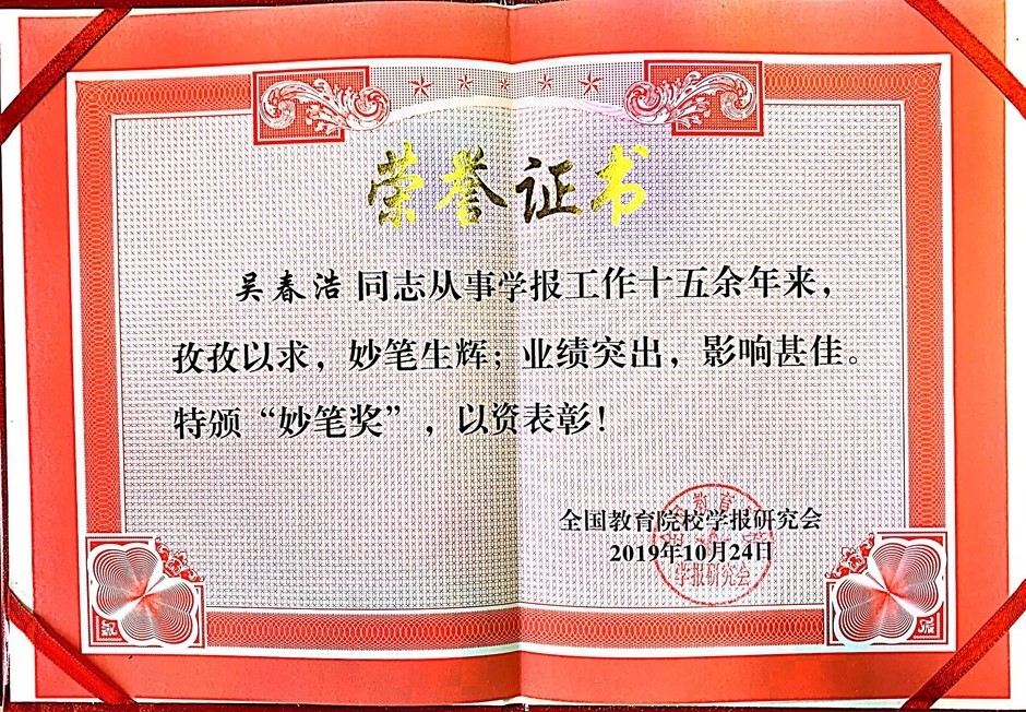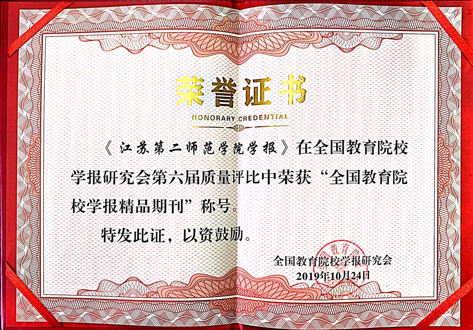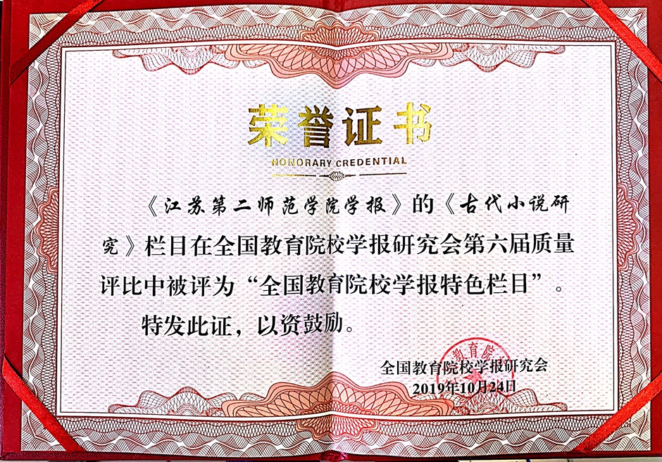 10月25日,全国教育院校学报研究会2019年学术年会在成都召开,会议听取了研究会的工作报告,并进行了理事会成员的增补以及第六届期刊质量评比工作。在此次评比活动中,《江苏第二师范学院学报》荣获“全国教育院校学报精品期刊”称号,《古代小说研究》栏目荣获“全国教育院校学报特色栏目”称号,吴春浩同志荣获“妙笔奖”。