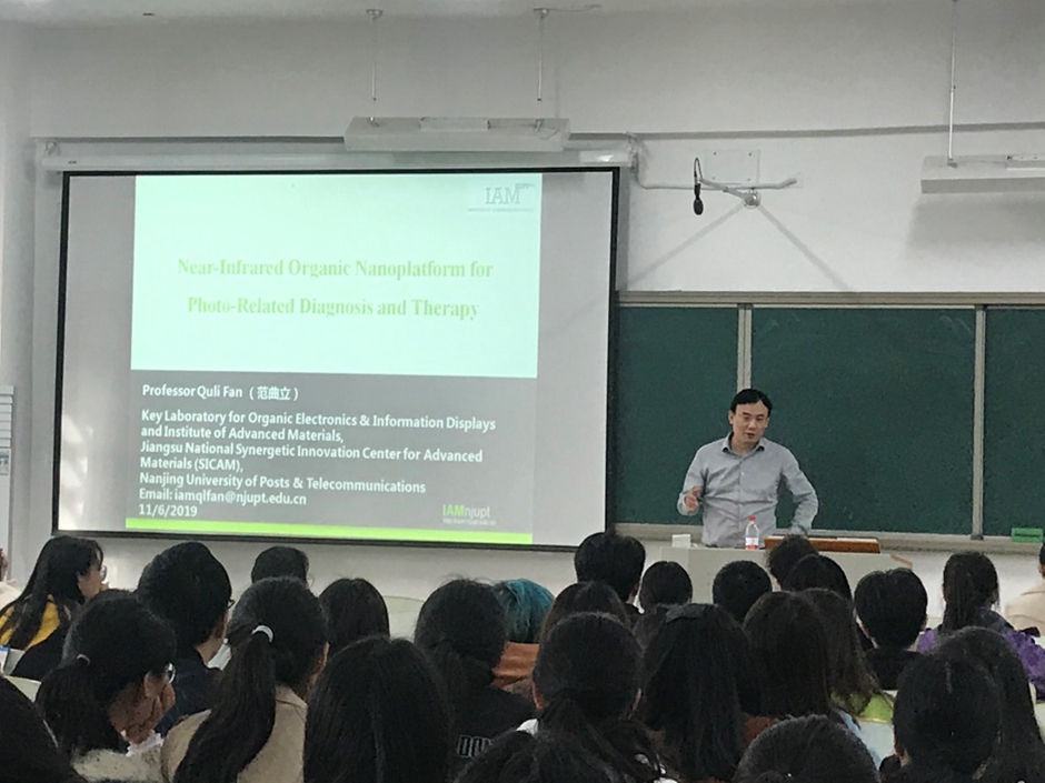 范教授作题为“用于光诊疗的近红外有机纳米体系的构建”的报告。他主要围绕特异性发光材料的设计和制备、相关有机材料在荧光成像以及光声成像上的应用展开论述。报告内容深入浅出,引起了参会者极大的兴趣。大家与范教授进行了热烈而深入的探讨。讲座最后,范教授简要介绍了南京邮电大学材料科学与光学工程学院的办学规模、研究方向、毕业生就业等情况,鼓励同学们踊跃报考该校的研究生。