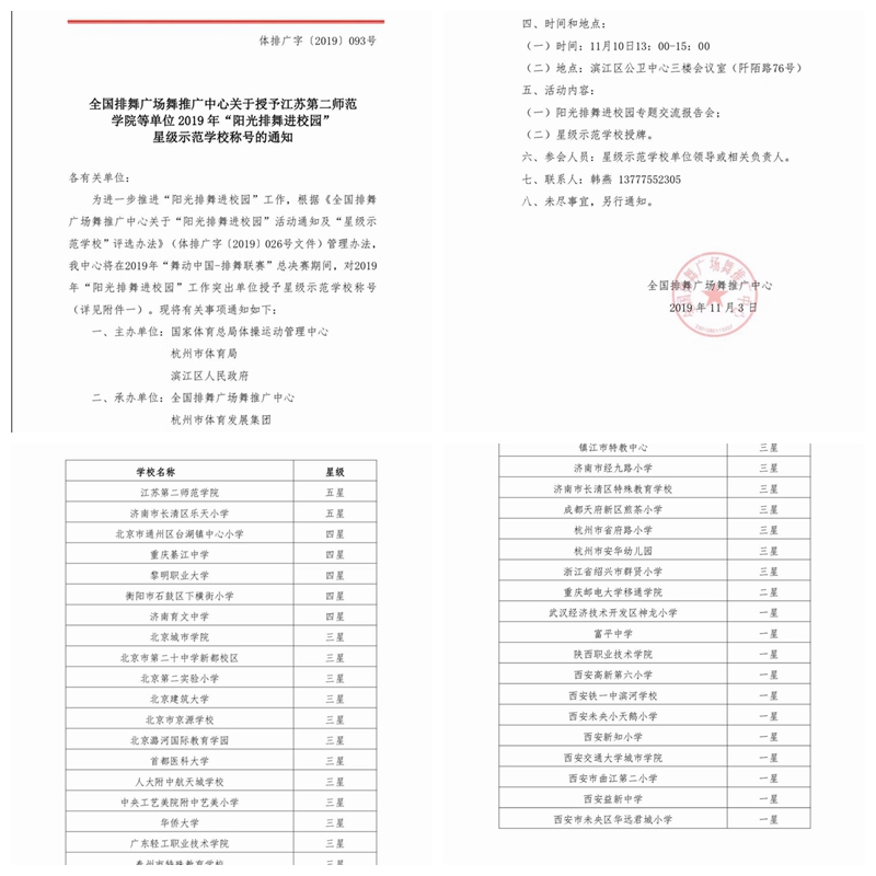 为进一步推动“阳光排舞进校园”工作,日前,全国排舞广场舞推广中心对2019年“阳光排舞进校园”工作突出单位授予星级示范学校称号。我校被授予2019年“阳光排舞进校园”五星级示范学校称号,成为江苏省第一所排舞五星级示范学校。