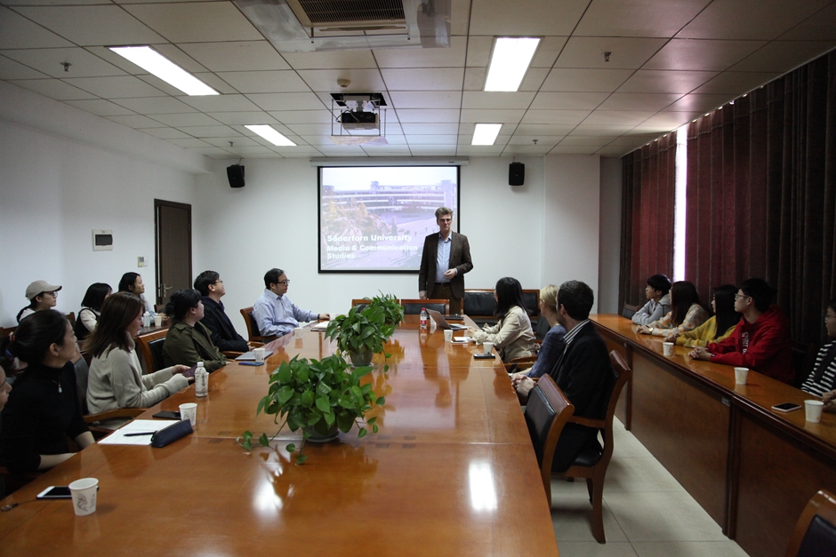 11月15日,瑞典索德脱恩大学传媒学院教授、欧洲科学院院士尤龙博士,国际合作处负责人佛雷德里克·施蒂恩特和约翰·法迪副教授一行与我校传媒学院进行中外合作办学交流。交流会由我校传媒学院副院长章力教授主持,传媒学院专业教师沈庆斌、欧逸帆、仇蓓蓓、张弛、王云、赵颖胤等和2017级数字媒体艺术普本班部分学生参加会议。