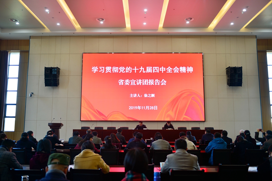 根据省委统一部署,省委宣讲团11月28日下午在我院宣讲党的十九届四中全会精神。省委宣讲团成员、省哲学社会科学界联合会党组成员、副主席徐之顺作宣讲报告。院党委书记王仁雷主持报告会。院长王建,院领导刘继红、潘文、王国强、祝兴成、王晓天、姚振标、刘贵友出席会议。全体党委委员、纪委委员,全体中层干部,离退休同志代表,基层党支部书记代表,党外人士代表,师生代表参加报告会。