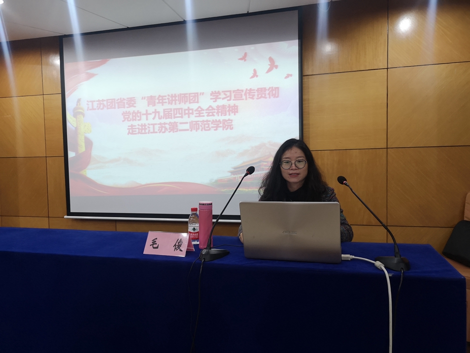 12月26日,江苏团省委“青年讲师团”成员、我校团委副书记(挂职)、马克思主义学院教师毛俊在草场门校区作题为《坚定制度自信 勇当时代使命》的报告,解读党的十九届四中全会精神。