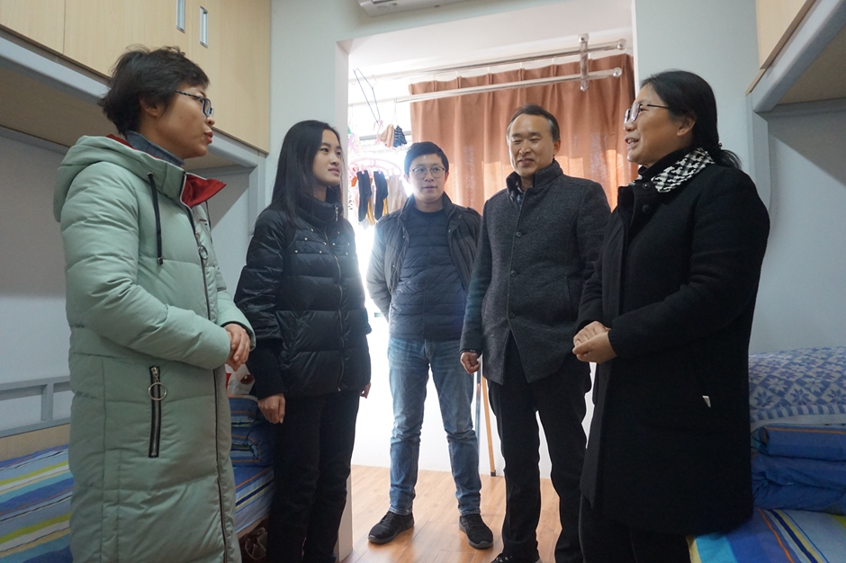 走访中,院领导认真检查宿舍卫生状况,排查寝室安全隐患。在学生宿舍,领导们与学生们亲切交谈,询问学生们的学习、生活近况,叮嘱学生们要注意劳逸结合,嘱咐同学们注意防寒保暖、注意宿舍防电防火、树立安全意识、积极备战考试、诚信应对考试。院领导们还亲切询问同学们寒假回家的车票购票情况并给学生们送上了新春慰问品,鼓励学生坚定理想信念,敢作为,有担当,书写新时代的新篇章。