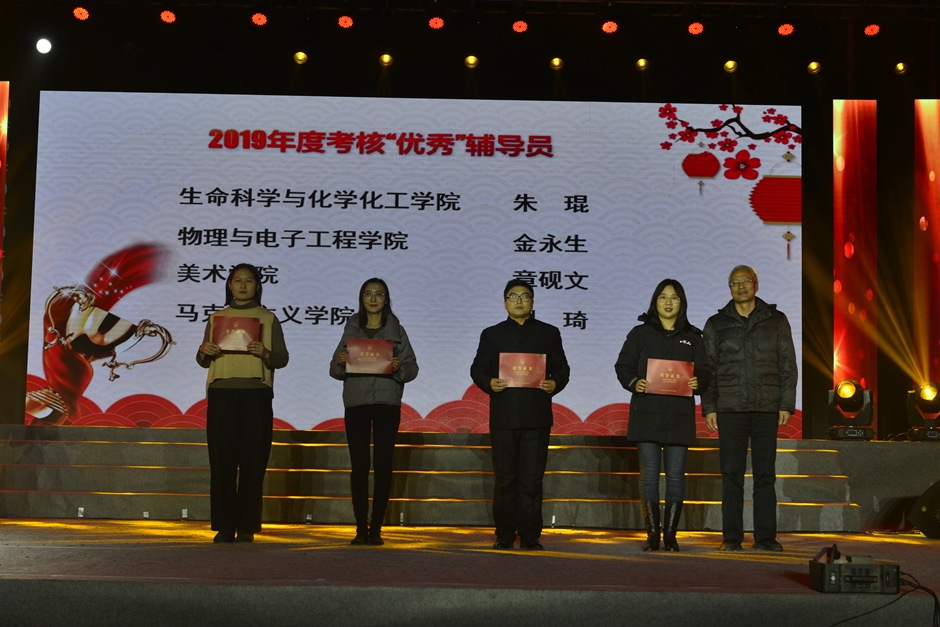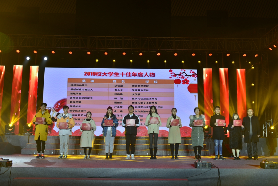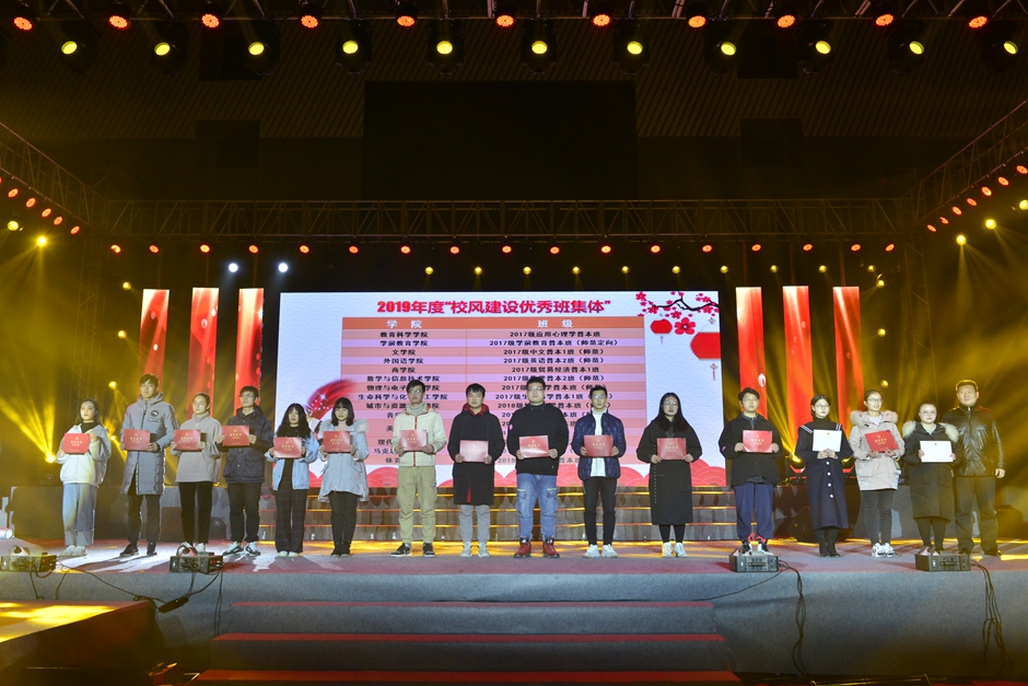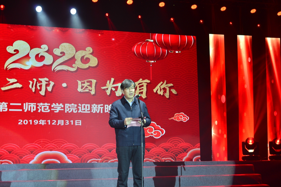 嘉年华新年乐——迎新年文艺晚会将迎新系列活动气氛推上了高潮。在宁全体校领导出席晚会,与各位嘉宾、师生代表欢聚一堂,共贺新年。王仁雷代表校党政向全校师生致以新年的问候和祝愿。他表示,学校一贯高度重视校园文化建设,营造了良好的校园文化氛围,获得诸多荣誉。石湫校区的顺利建成启用,为我校发展翻开了新的一页,希望大家为建设高水平有特色的师范学院而共同努力奋斗。晚会节目有歌唱、器乐合奏、相声、小品、舞蹈、诗朗诵等,形式多样,精彩纷呈。现场还进行了一系列颁奖仪式。副校长祝兴成压轴出场,一首《小白杨》饱含深情、感人至深,把晚会气氛推向了高潮。