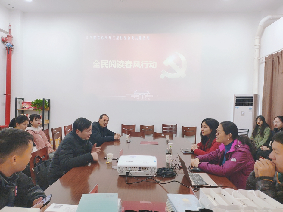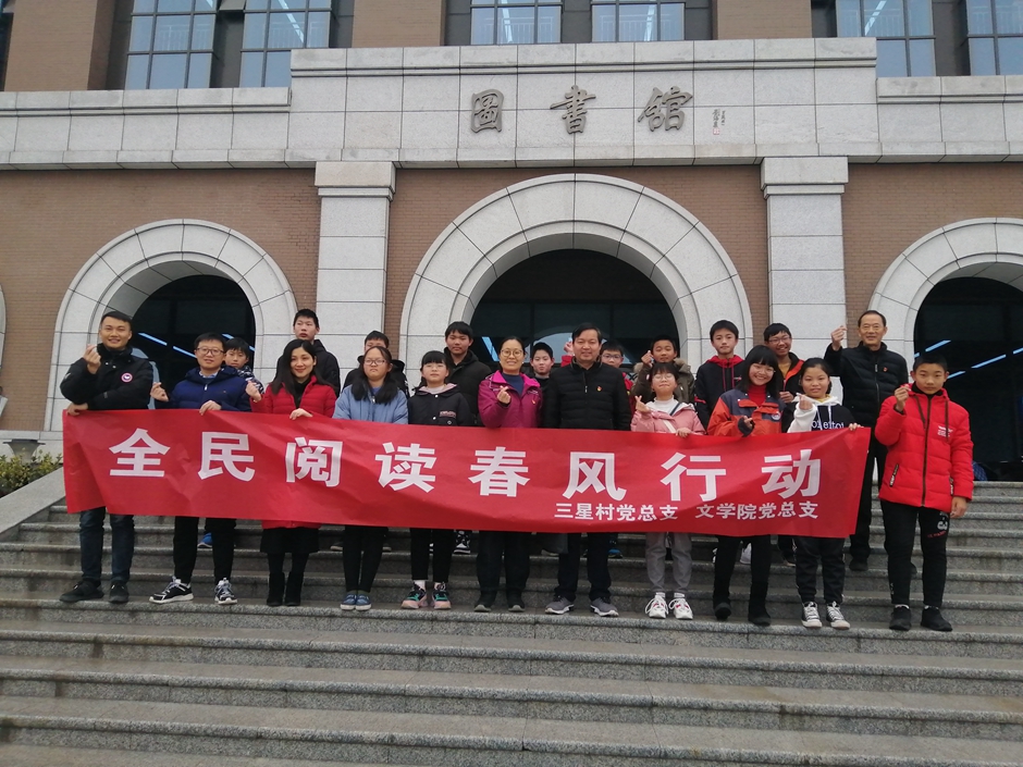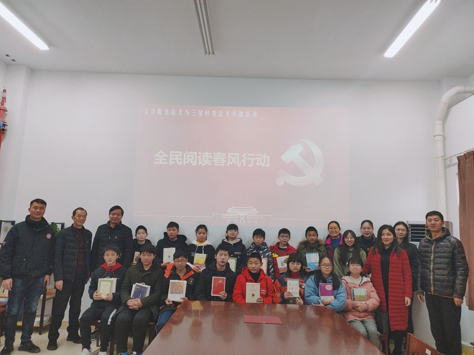 2020年1月11日上午,石湫街道三星村党总支组织15名初中学生来我校文学院开展“全民阅读春风行动”活动。该村党总支书记黄世双,党总支副书记赵治兔,党建工作者殷勤参加活动。文学院党总支书记刘莹、党总支副书记陶赋雯、学生党支部书记戴晓凤、辅导员张想予以热情接待。