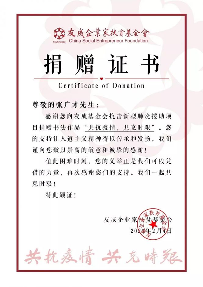 近日,我校美术学院教师张广才向友成企业家扶贫基金会抗击新型肺炎援助项目捐赠书法作品“共抗疫情,共克时艰”,为疫情防控阻击战加油鼓劲。