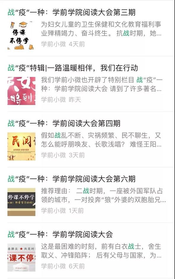 学前教育学院在疫情期间陆续推出了十二期阅读大会,邀请地处武汉的长江少儿出版社总编辑姚磊,“书香江苏”形象大使祁智,“五个一工程奖”获得者韩青辰,全国优秀儿童文学奖历届获奖者程玮、刘健屏、徐玲、郭姜燕等数位著名儿童文学作家,《扬子江诗刊》副主编晓华,《钟山》副主编何同彬等名家,以及本院姚苏平、田燕、王晶、吴巍莹、顾媛媛、王艳、刘军豪、史晓倩、张学而、吴子吟等诸位教师,从不同学科视角、专业领域、身份处境,为同学们推荐书目,并通过“寄语”的方式让大学生在这场抗“疫”战争中,学会坚守、懂得担当、看到希望。同时,该院储秀峰、诸烟霏等同学主动以“志愿者”的身份走上街头,以实际行动抗击疫情;同学们还通过捐款、作诗、作画等方式,为抗“疫”贡献一己之力。
