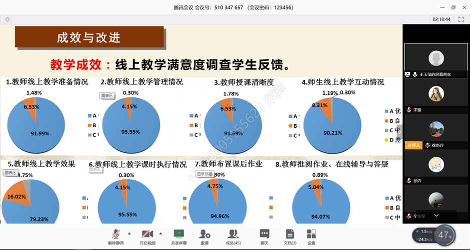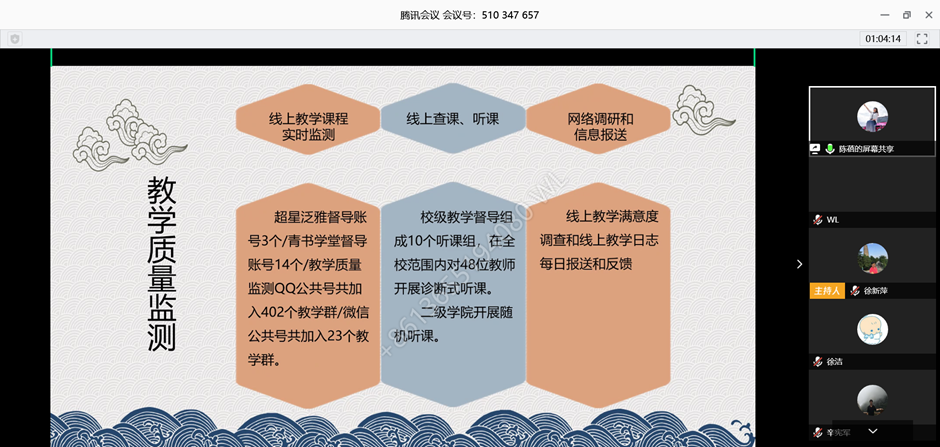 教务处处长徐新萍对各部门前期线上教学组织与实施工作给予了肯定。她指出,线上教学稳步推进近两周以来,教学秩序良好,但应继续加强教学管理,积极开展线上教学研究,强化线上教学督导,保证线上教学与线下教学同质等效。她强调线上教学需切实提高风险意识,高度关注在线教学意识形态领域风险把控。她要求广大教职员工要注意舆论导向,不造谣、不传谣、不信谣,大家共同努力,确保我校在线教学环境优质健康、在线教学工作平稳安全高质量地开展。