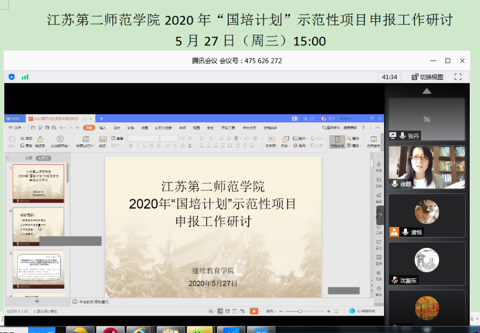 5月27日下午,继续教育学院牵头组织召开2020年“国培计划”示范性项目申报工作研讨腾讯会。12个二级学院院长和相关老师共计21人参会,继教院院长徐群主持会议。