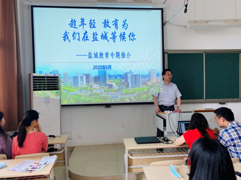 6月8日中午,盐城市教育局专招组来我校石湫校区举办教师招聘宣讲会,向我校2020届本科毕业生宣传盐城市教师招聘录用政策。招生就业处副处长黄晓波主持会议。
