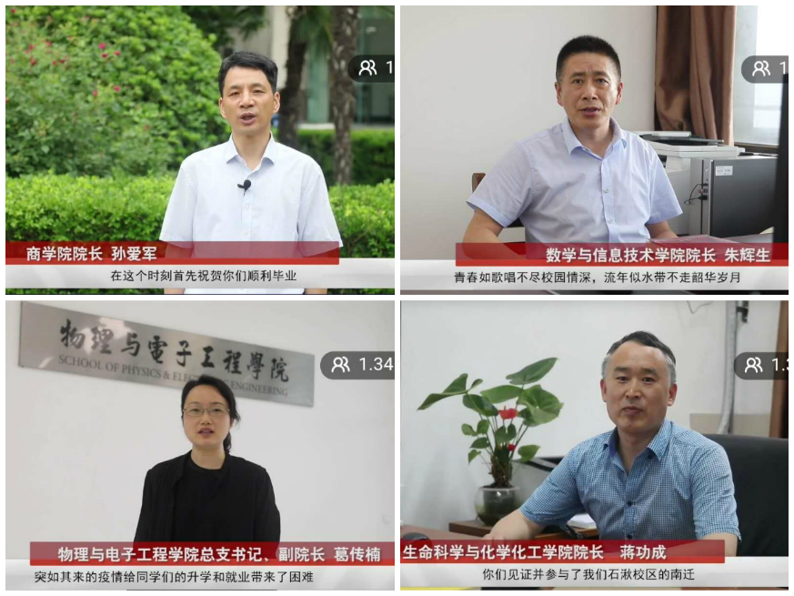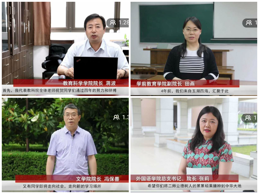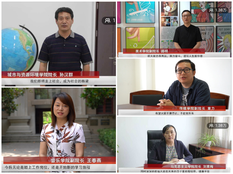 直播首先回顾了2020届毕业生从入学到毕业以来4年的学习与生活。13个学院的3000多名毕业生青春洋溢,朝气蓬勃,刻苦学习,努力奋斗,先后获得了全国大学生艺术展演一等奖、全国排舞锦标赛一等奖、国际和平海报双年展金奖等系列奖项。