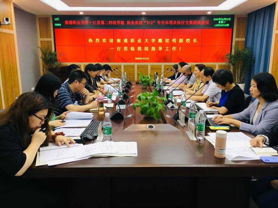 6月23日下午,我校与南通职业大学在我校石湫校区召开商务英语“3+2”专升本项目执行方案商谈会。南通职业大学党委委员、副校长戴世明,教务处处长周开俊、国际合作教育学院院长刘万生以及副院长庞德美一行八人参加会议。我校副校长徐国华、教务处处长徐新萍、招就处处长司南、外国语学院院长张莉及副院长梁婧玉等参加会议。张莉主持会议。