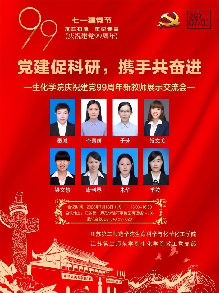 7月13日下午,生化学院教工党支部召开“党建促科研,携手共奋进”庆祝建党99周年新教师科研交流会。本次会议采用线下和线上同步直播的形式,党总支书记陈建琴,副院长杜攀,教工党支部书记丁正峰,支部委员赵倩和钱广胜,学院8位新进教师,其他教师代表,一起在明理楼335会议室参加交流活动,17级和18级的100余位学生在腾讯会议平台全程参与交流讨论。