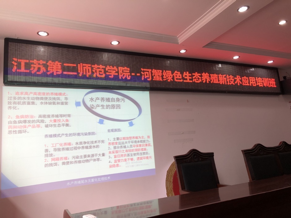 8月15日,我校生命科学与化学化工学院和水生生物研究所蒋功成教授、丁正峰副教授应宝应县农业农村局邀请,在当地开办了“河蟹绿色生态养殖新技术”培训班。宝应县水产站、江苏省水仙公司科技人员及各乡镇渔技推广员共计40余人参加了此次培训。
