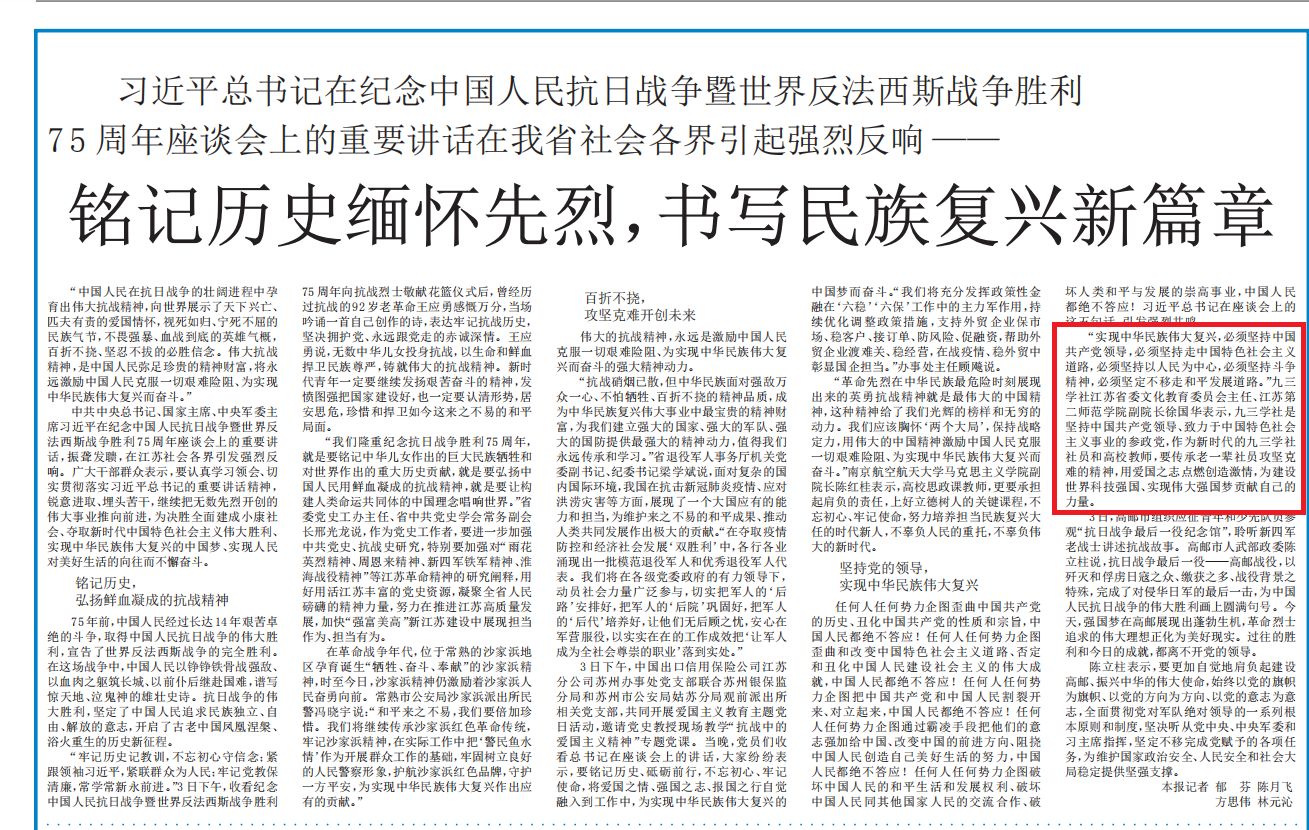 编者按:9月3日,中共中央总书记、国家主席、中央军委主席习近平在纪念中国人民抗日战争暨世界反法西斯战争胜利75周年座谈会上的重要讲话,振聋发聩,在江苏社会各界引发强烈反响。我校副校长徐国华接受新华日报记者采访时表示,要传承老一辈社员攻坚克难的精神,用爱国之志点燃创造激情,为建设世界科技强国、实现伟大强国梦贡献自己的力量。