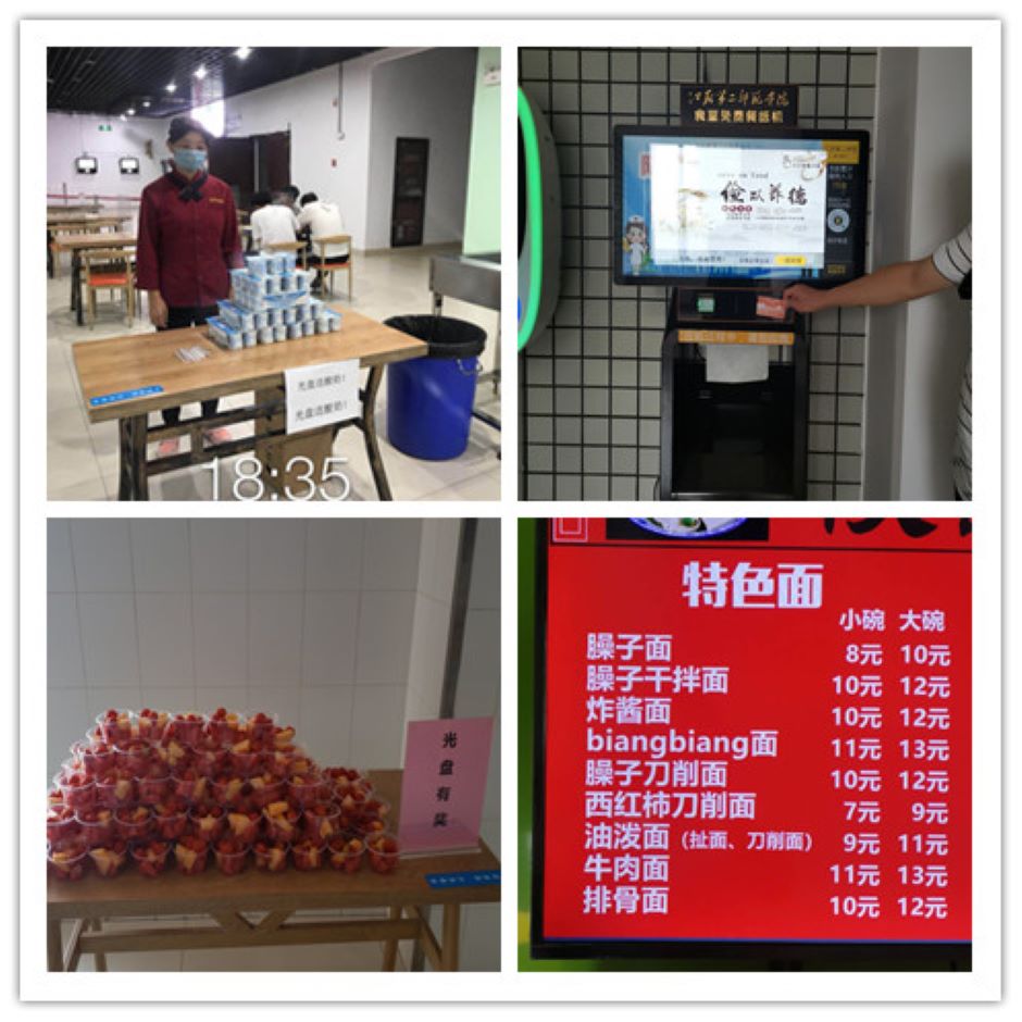后勤处指导两校区各餐厅在显著位置张贴了以“节约粮食”“文明餐桌”“光盘行动”等为主题的宣传画、提示语,通过大屏幕滚动播放节约粮食的宣传视频,推进氛围营造深入化。自营学生餐厅和各风味餐厅开设“小份菜”窗口,在部分餐饮品种引入大小份阶梯定价机制,推进选餐形式多元化。各餐厅不定期开展“光盘送礼物”“晒光盘送餐券”等师生喜闻乐见的活动,向响应“光盘行动”号召的师生赠送水果、酸奶、纸巾等小礼品和定额抵用餐券,推进主题活动多样化。教工餐厅设立了“免费餐纸机”并接入校园一卡通系统,倡导教工按需刷卡取用,推进节约行为智慧化。