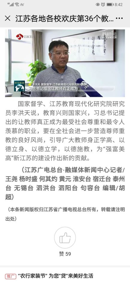 国家督学、江苏教育现代化研究院研究员李洪天说,教育兴则国家兴,习近平总书记提出的让教师真正成为最受社会尊重和最令人羡慕的职业,要在全社会进一步营造尊师重教的良好风尚,引导广大教师身正学高、以德立身、以德立学,以德施教,为“强富美高”新江苏的建设作出新的贡献。