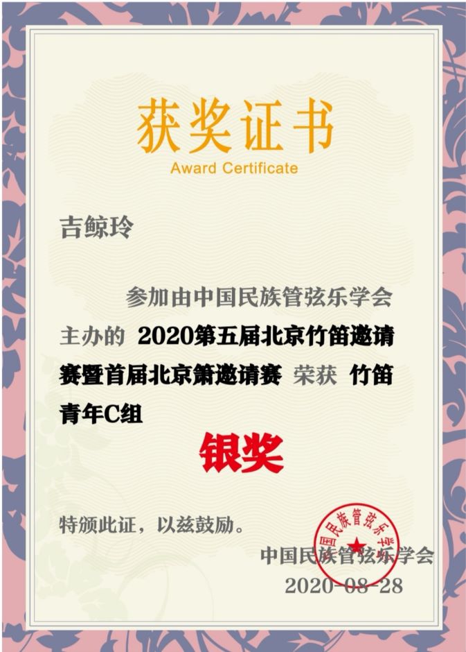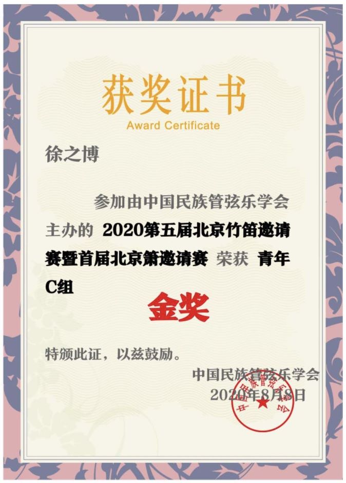 日前,音乐学院16级普本班徐之博同学、18级普本班吉鲸玲同学在曾明老师的悉心指导下,参加中国民族管弦乐2020第五届北京竹笛邀请赛暨首届北京箫邀请赛,分别荣获青年C组金奖与银奖。