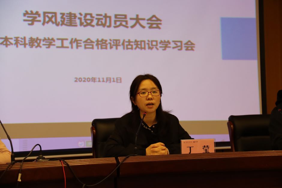 会上,丁莹指出学风是一所学校校风的重要体现和核心要素,它是学生在校学习生活过程中所表现出来的精神面貌,是学生在校园中经过长期教育和影响逐渐形成的行为风尚。建设优良学风是建设优良校风的中心任务和根本保证。她强调,全体党员、发展对象、积极分子和学生干部要在学风建设中加强责任担当,强化落实力度,端正学习态度,以良好的精神风貌为学院的学风建设作出贡献,助力本科教学工作合格评估顺利通过。
