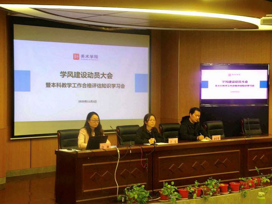 11月1日下午,美术学院在草场门校区召开学风建设动员大会暨本科教学工作合格评估知识学习会。该院党总支书记丁莹、党总支副书记孙仕荣、学工办主任白丽出席会议。全体党员、发展对象、积极分子、学生会全体成员、班级全体学生干部参加。会议由白丽主持。
