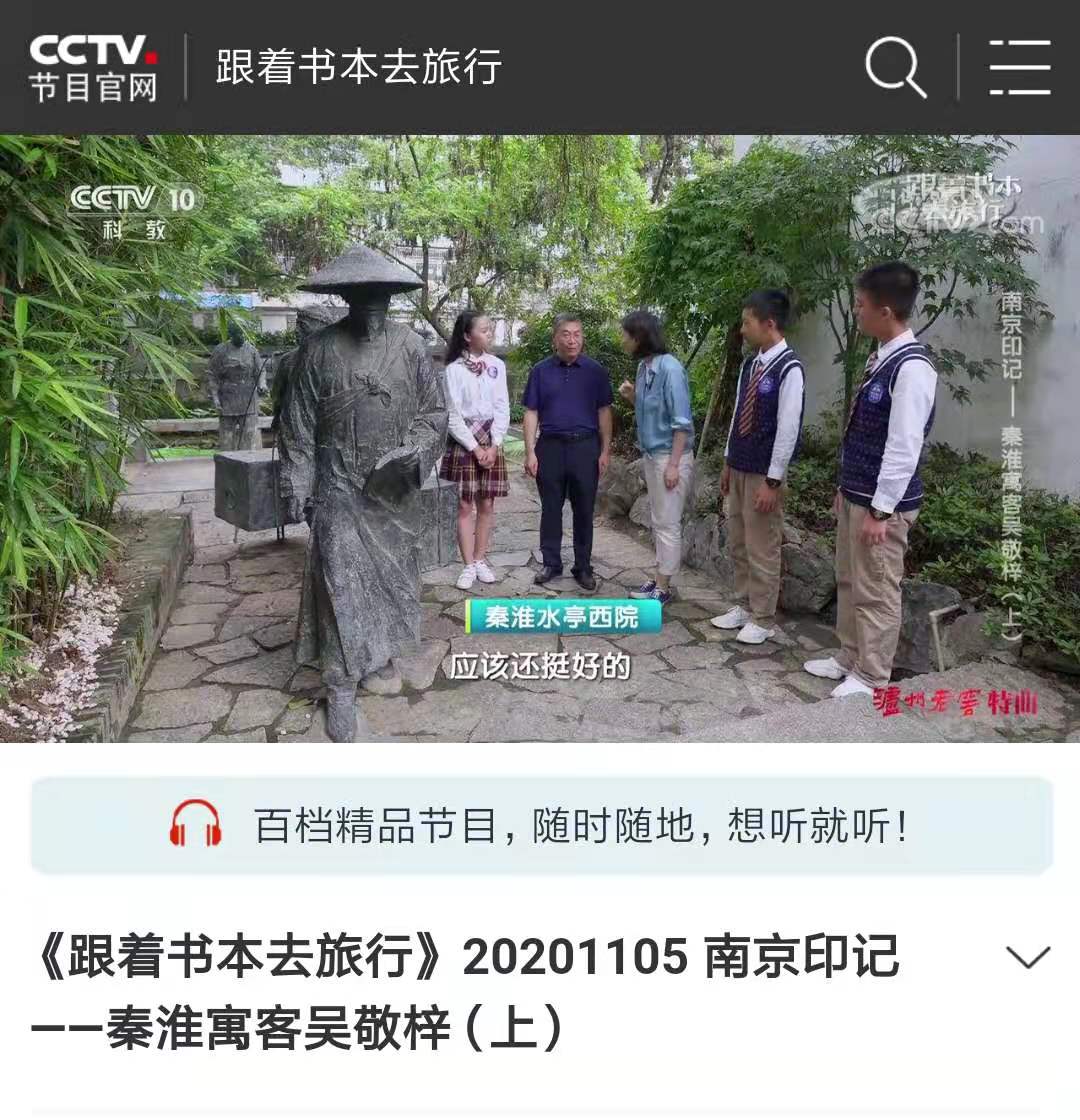 11月起,中央电视台科教频道将播出《跟着书本去旅行》系列节目之“南京印记”,这是一档体验式文化教育节目,是以中小学课本或经典名著为线索,在“读万卷书”的同时“行万里路”,走近文化古迹,触摸历史,感知文化,近距离感受经典之美。