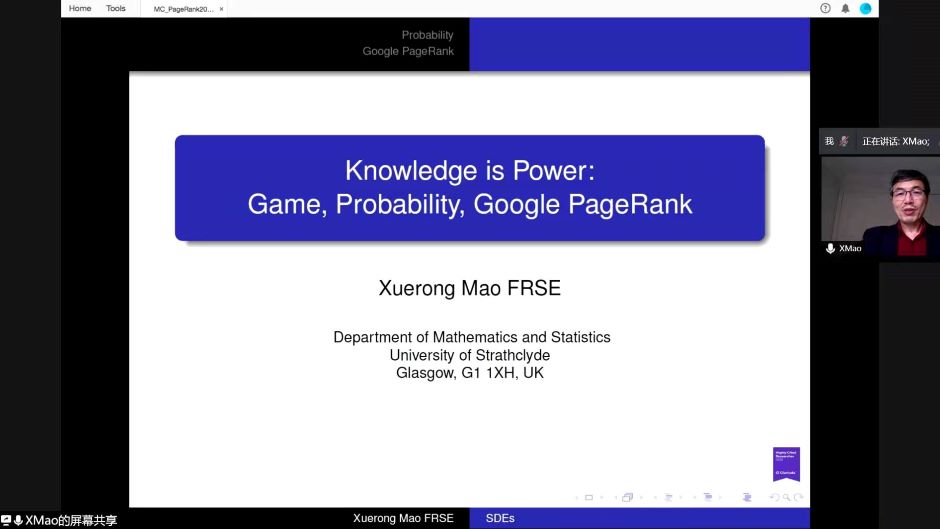 11月20日,数信学院特邀英国爱丁堡皇家学会院士Xuerong Mao教授为师生开设题为“Knowledge is Power: Game, Markov Chain and PageRank”的学术讲座。讲座采用腾讯会议在线进行,数信学院毛伟老师主持,数信学院近80名师生通过在线会议聆听讲座。