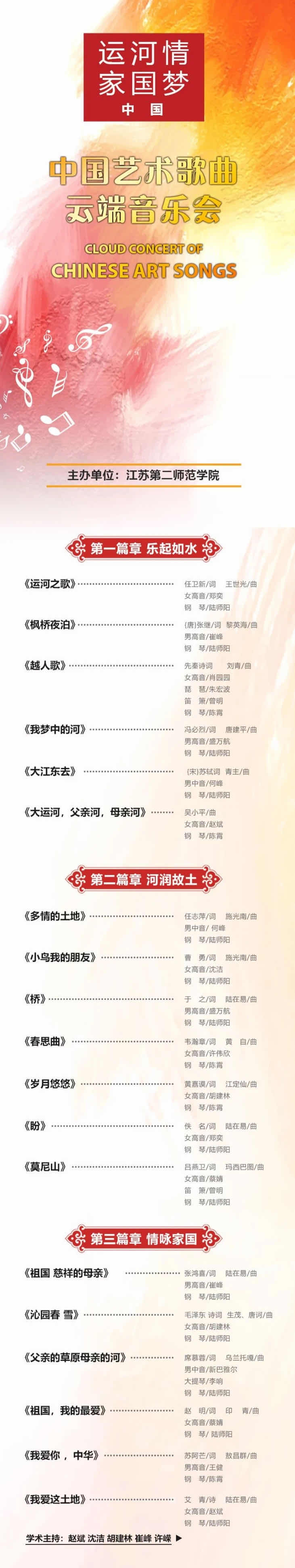 此次云端音乐会分为《乐起如水》、《河润故土》、《情咏家国》三个篇章,共有《运河之歌》、《多情的土地》、《祖国慈祥的母亲》等19首曲目,此外,增设访谈环节,歌唱家们将带领音乐爱好者全面感受艺术歌曲的魅力。据音乐会相关负责人介绍,江苏第二师范学院非常重视运河文化的挖掘,打造了京杭大运河江苏流域戏剧文化传承创新项目,接下来他们将在传承创新领域继续开拓研究,用更加多元的艺术形式,做好有关“大运河文化”的系列音乐活动。