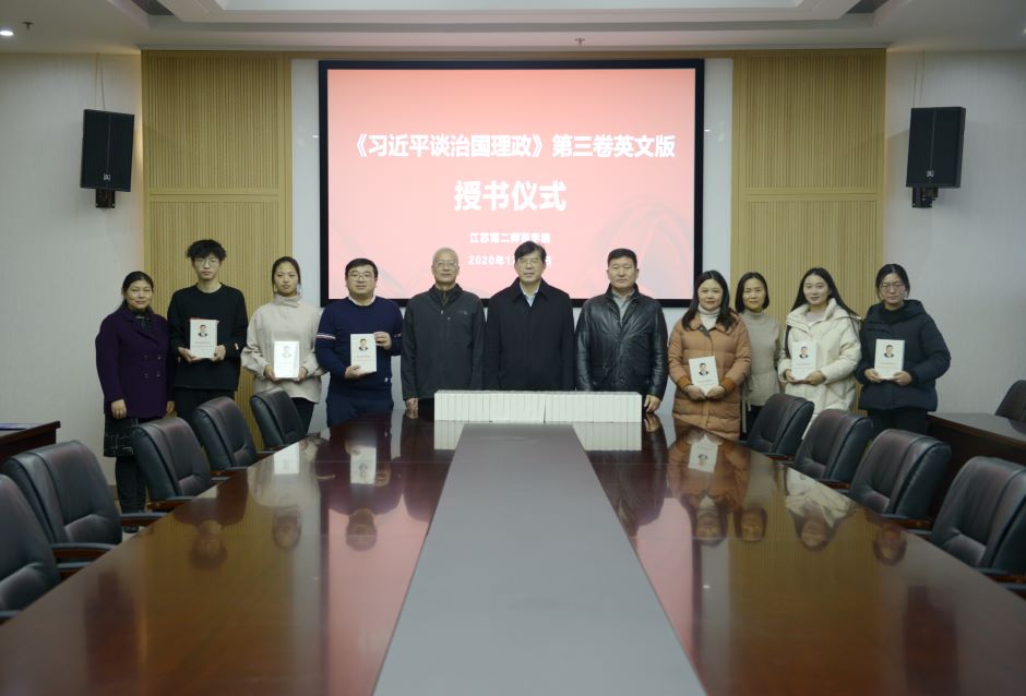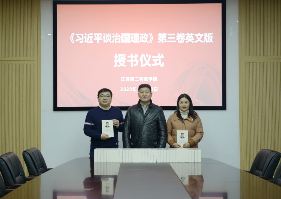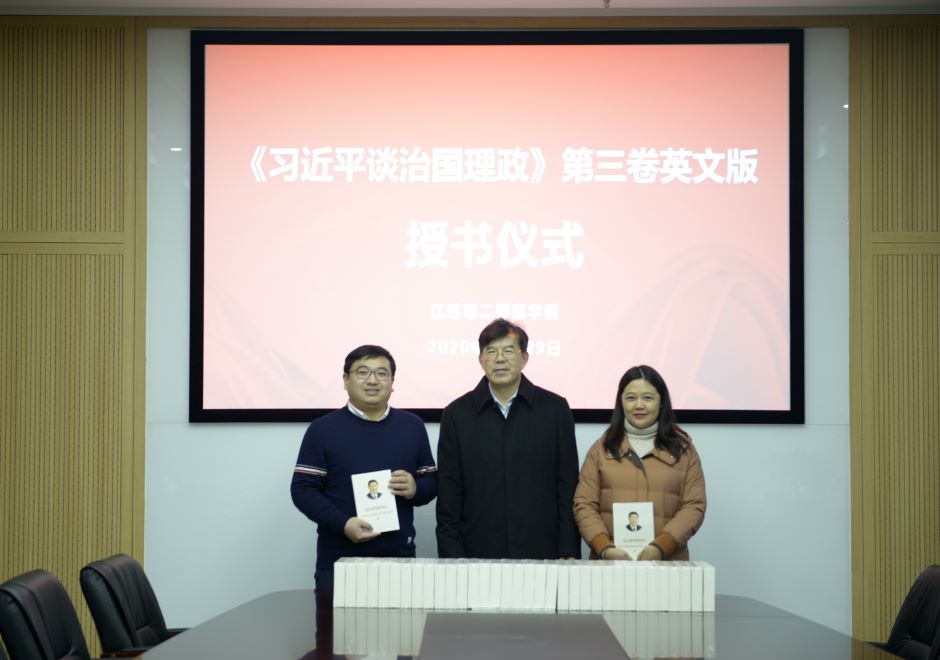 12月29日,我校在石湫校区举行《习近平谈治国理政》第三卷英文版授书仪式。党委书记王仁雷、党委副书记潘文、总会计师姚振标出席仪式。党委宣传部部长卜玉平等,外国语学院党总支书记、院长张莉,党总支副书记余鑫,部分学生代表参加仪式。