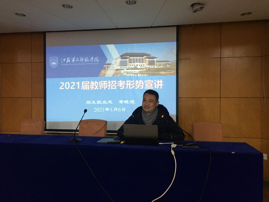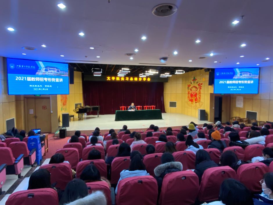 1月6日,招生就业处利用文学院、外国语学院举行毕业班实习分享会和班会的契机,分赴两个学院师范毕业班进行2021届教师招考形势宣讲。招生就业处处长司南、副处长黄晓波等参加宣讲。