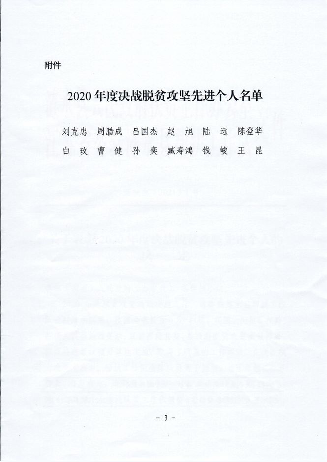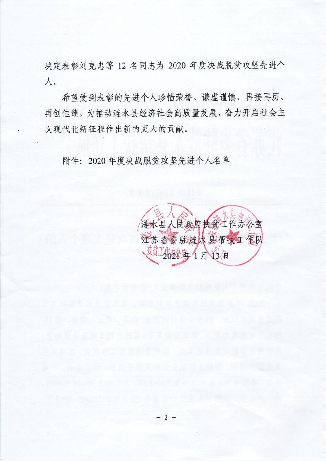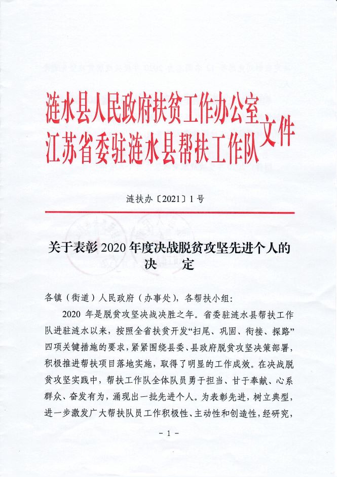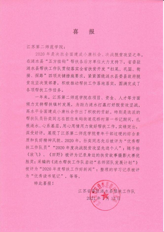 近日,省委驻涟水县帮扶工作队发来喜报,对我院助力扶贫工作给予充分肯定。同时,涟水县人民政府扶贫工作办公室、江苏省委驻涟水县帮扶工作队印发《关于表彰2020年度决战脱贫攻坚先进个人的决定》,对我院驻涟扶贫干部孙奕在内的12名同志进行表彰。