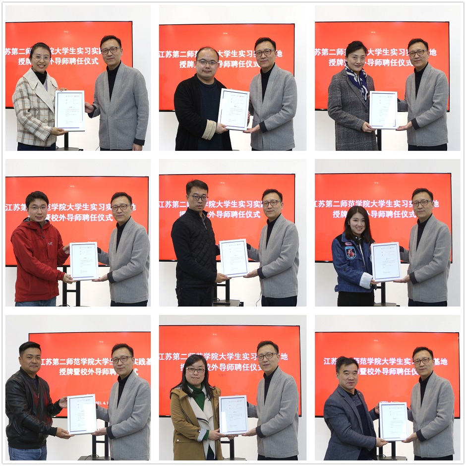 4月14日下午,美术学院在草场门校区举办实习实践基地授牌暨校外导师聘任仪式。副校长祝兴成、南京条约史料陈列馆(南京静海寺纪念馆)馆长苏真、南京中国科举博物馆副馆长尹磊、南京博物院社会服务部副主任许越、江苏智酷传媒总经理史甄、江苏云魔方新媒体发展有限公司副总经理范从进、南京大学附属中学初中部教务处主任潘频、上海梅山高级中学教师杨邦训、美术学院副院长路明、美术学院党总支副书记孙仕荣、美术学院各专业教研室主任以及教师代表出席仪式,仪式由美术学院副院长陶金鸿主持。