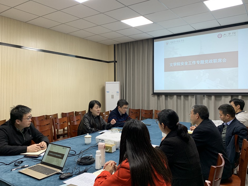 4月14日中午,党委副书记刘继红、学工处处长杨思贤、招就处处长司南来到文学院,列席文学院安全工作专题党政联席会,文学院党政班子全体出席,会议由文学院党总支书记刘莹主持。