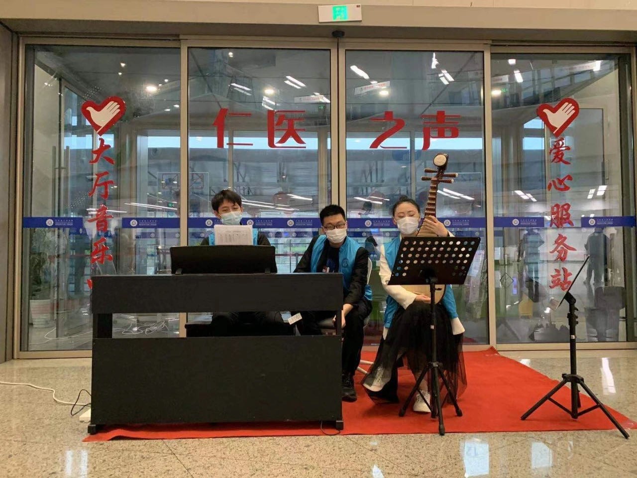 音乐学院学生组成“曙光行动”志愿者小分队,每周三下午来到江苏省肿瘤医院和江苏省人民医院,将音乐和热情送到医患身边。志愿者们用手中的二胡、竹笛、琵琶等乐器演奏《我和我的祖国》《唱支山歌给党听》等耳熟能详的红色歌曲,给现场病患及家属带来心灵上的治愈,在音乐中学习党史、在志愿服务中践行初心使命。